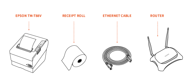 Before you start, make sure that you have the 1) printer, 2) receipt paper rolls, an 3) ethernet or LAN cable, and a 4) router