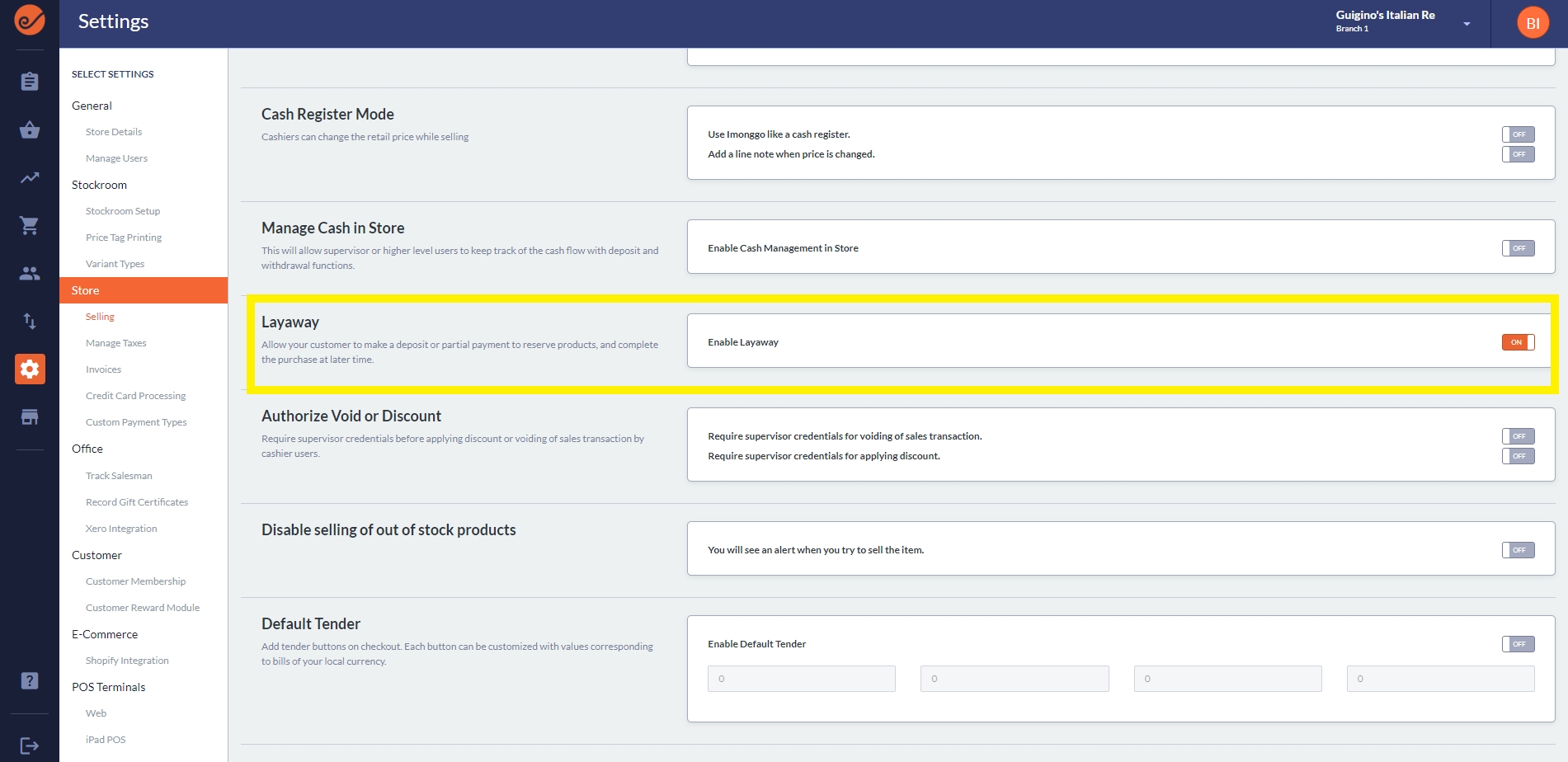 The first step is to activate Layaway by going to your settings, click on Selling, and scroll down to Layaway. Enable Layaway by clicking the switch then scroll up and click the Save button.