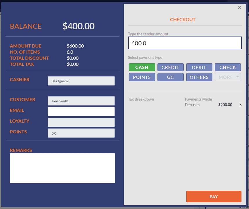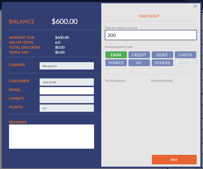 This will redirect you back to the checkout page where the balance of the transaction is ready for checkout. Click on Checkout, input the payment and the Pay button.