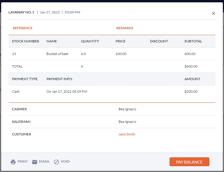 The transaction information will popup. Here you can see the details of the layaway transaction. You have the option to print, email, void or pay balance. Click on the Pay Balance button.