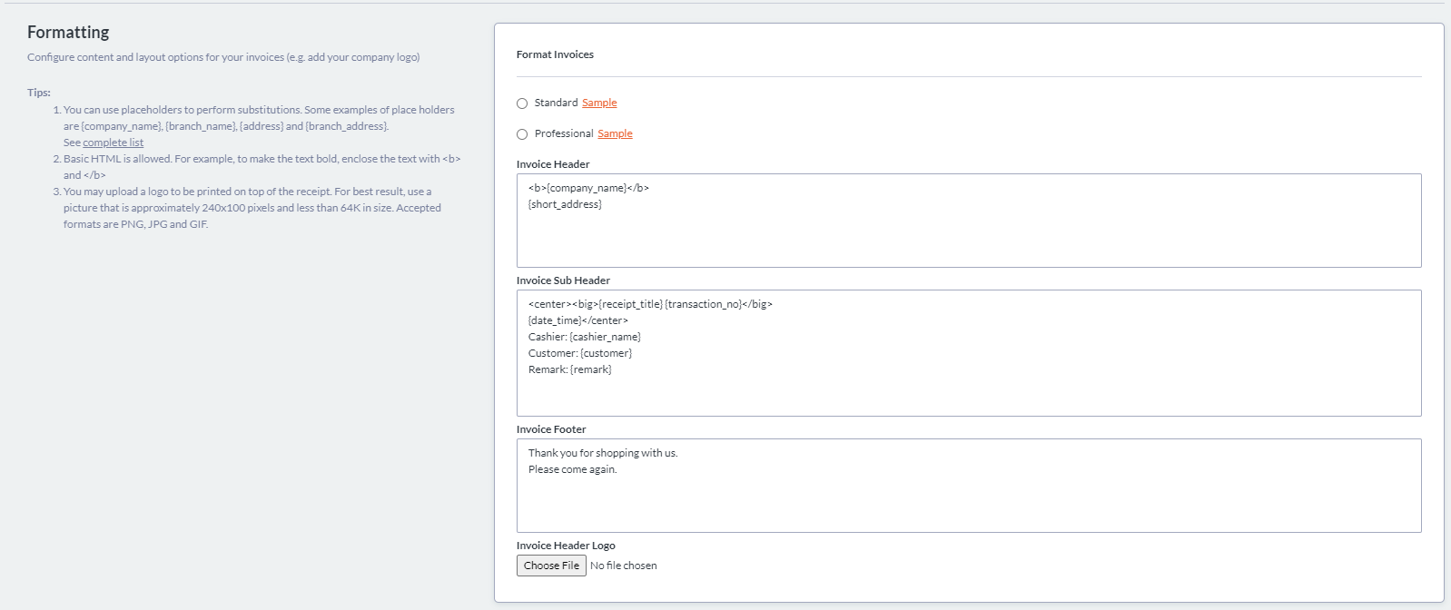 You can now customize your invoice printout depending on your choice of format: