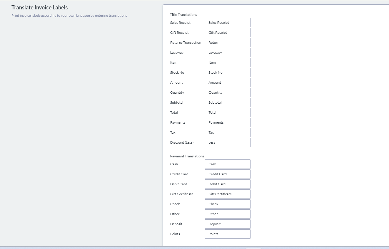 Scroll down thru the page and you'll see **Translate Invoice Labels.** You can now modify your invoice print out using your local language. Don't forget to click **SAVE.**
